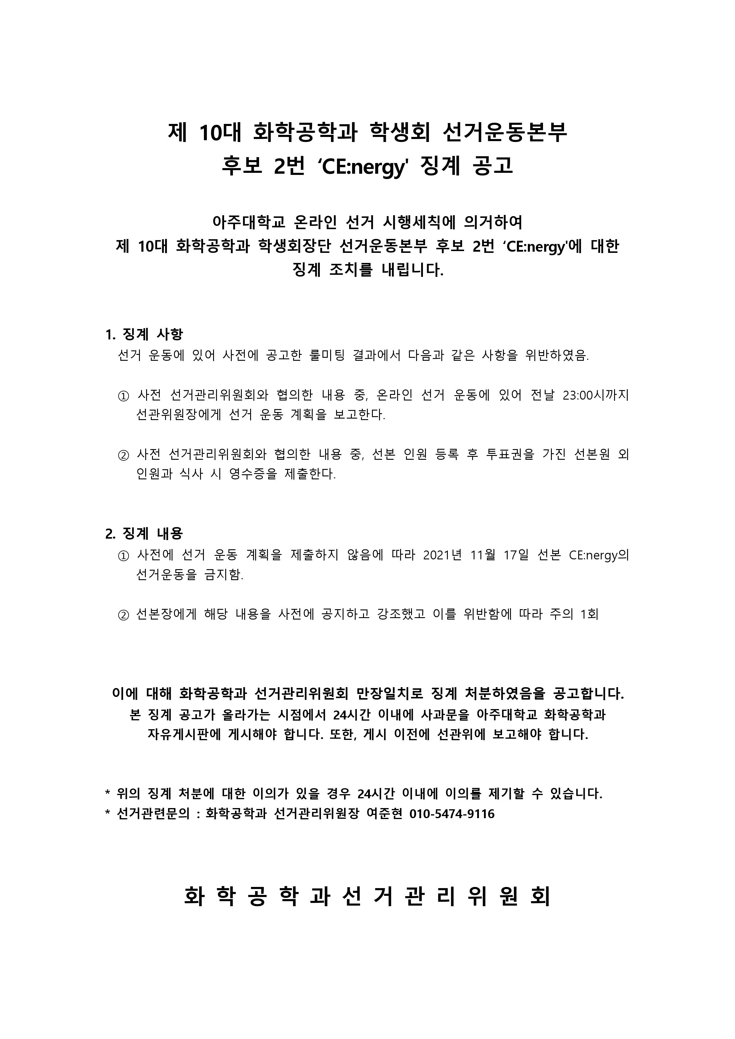 아주대학교 온라인 선거 시행세칙에 의거하여 제 10대 화학공학과 학생회장단 선거운동본부 후보 2번 ‘CE:nergy'에 대한 징계 조치를 내립니다. 1. 징계 사항 선거 운동에 있어 사전에 공고한 룰미팅 결과에서 다음과 같은 사항을 위반하였음. ① 사전 선거관리위원회와 협의한 내용 중, 온라인 선거 운동에 있어 전날 23:00시까지 선관위원장에게 선거 운동 계획을 보고한다. ② 사전 선거관리위원회와 협의한 내용 중, 선본 인원 등록 후 투표권을 가진 선본원 외 인원과 식사 시 영수증을 제출한다. 2. 징계 내용 ① 사전에 선거 운동 계획을 제출하지 않음에 따라 2021년 11월 17일 선본 CE:nergy의 선거운동을 금지함. ② 선본장에게 해당 내용을 사전에 공지하고 강조했고 이를 위반함에 따라 주의 1회 이에 대해 화학공학과 선거관리위원회 만장일치로 징계 처분하였음을 공고합니다. 본 징계 공고가 올라가는 시점에서 24시간 이내에 사과문을 아주대학교 화학공학과 자유게시판에 게시해야 합니다. 또한, 게시 이전에 선관위에 보고해야 합니다. * 위의 징계 처분에 대한 이의가 있을 경우 24시간 이내에 이의를 제기할 수 있습니다. * 선거관련문의 : 화학공학과 선거관리위원장 여준현 010-5474-9116 화 학 공 학 과 선 거 관 리 위 원 회