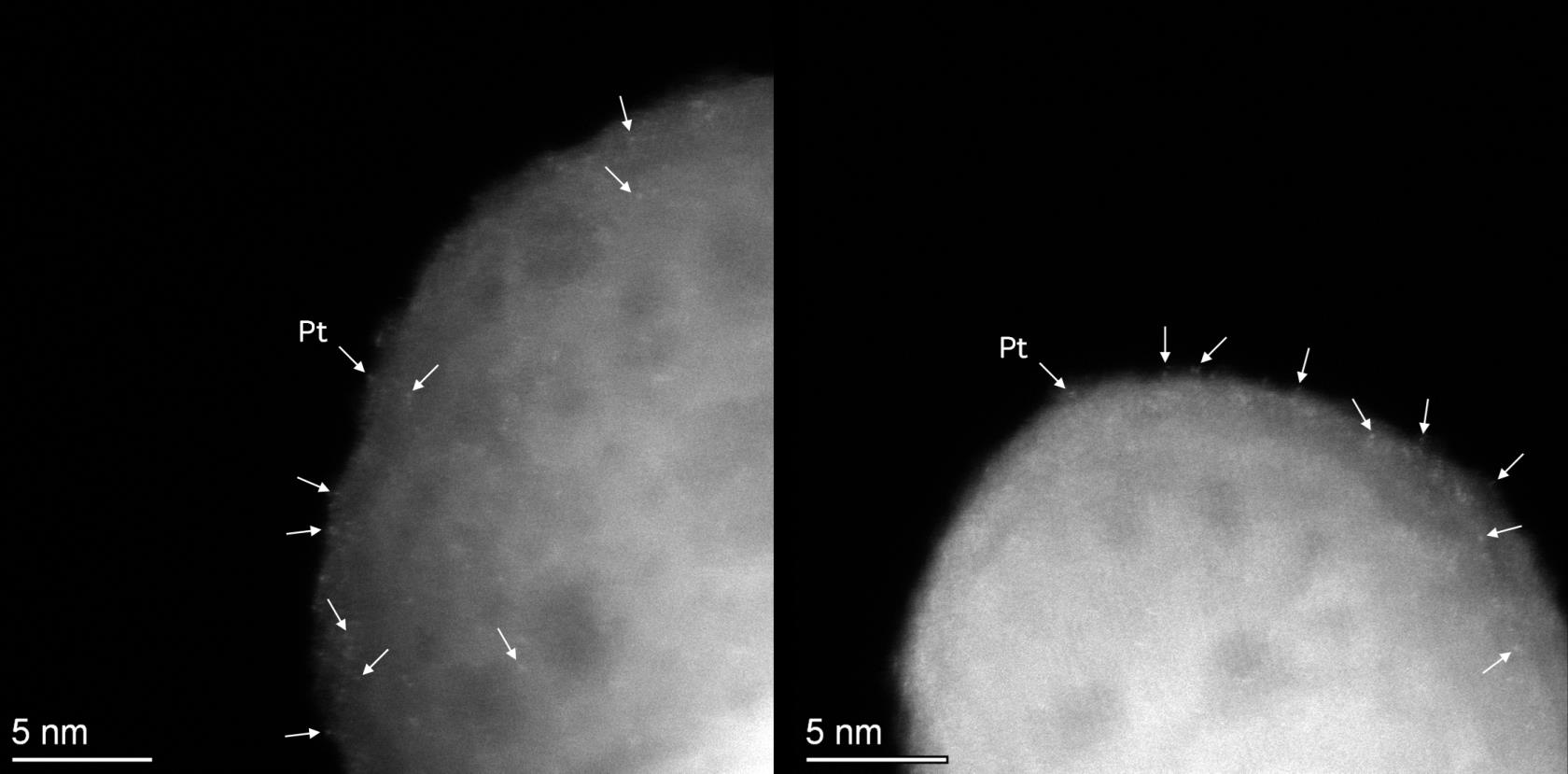 백금이 뭉치지 않고 안정적으로 분산된 상태임을 확인할 수 있다. 이렇게 되면 촉매의 질량당 활성이 향상되어, 백금을 최소한으로 활용할 수 있으며