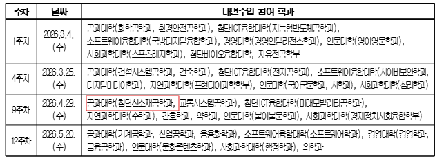 첨단신소재공학과는 4주차(2026.04.29.수요일) 연암관 대강당에서 대면수업으로 진행된다고 합니다.