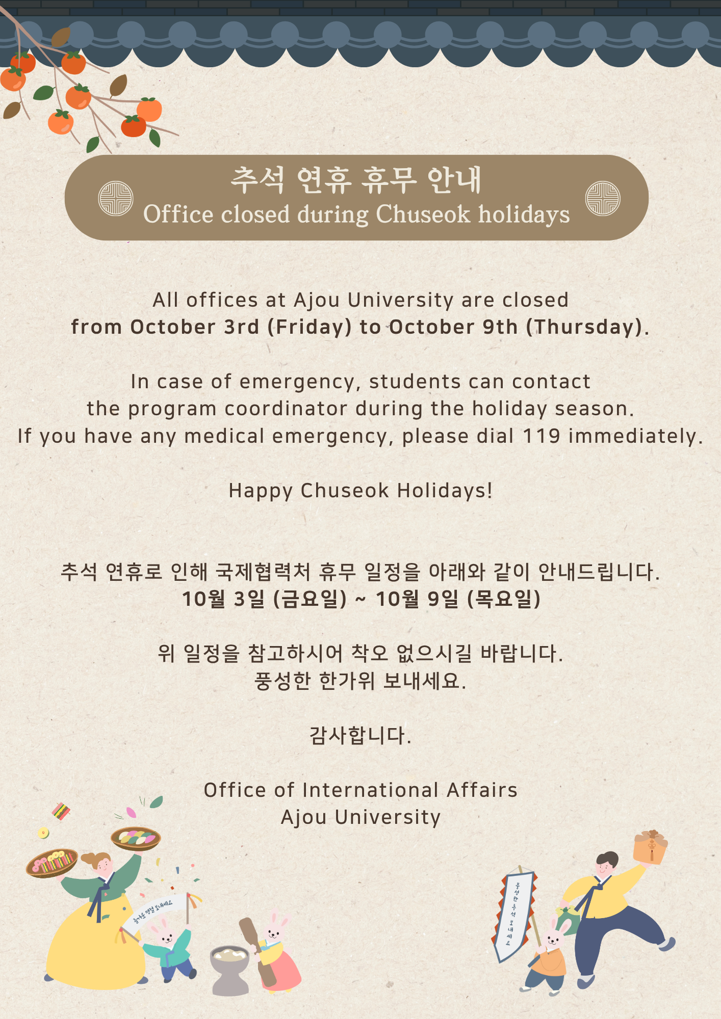[Student Life] Office closed during Chuseok holidays / 추석연휴 휴무일정 안내 (English/국문)