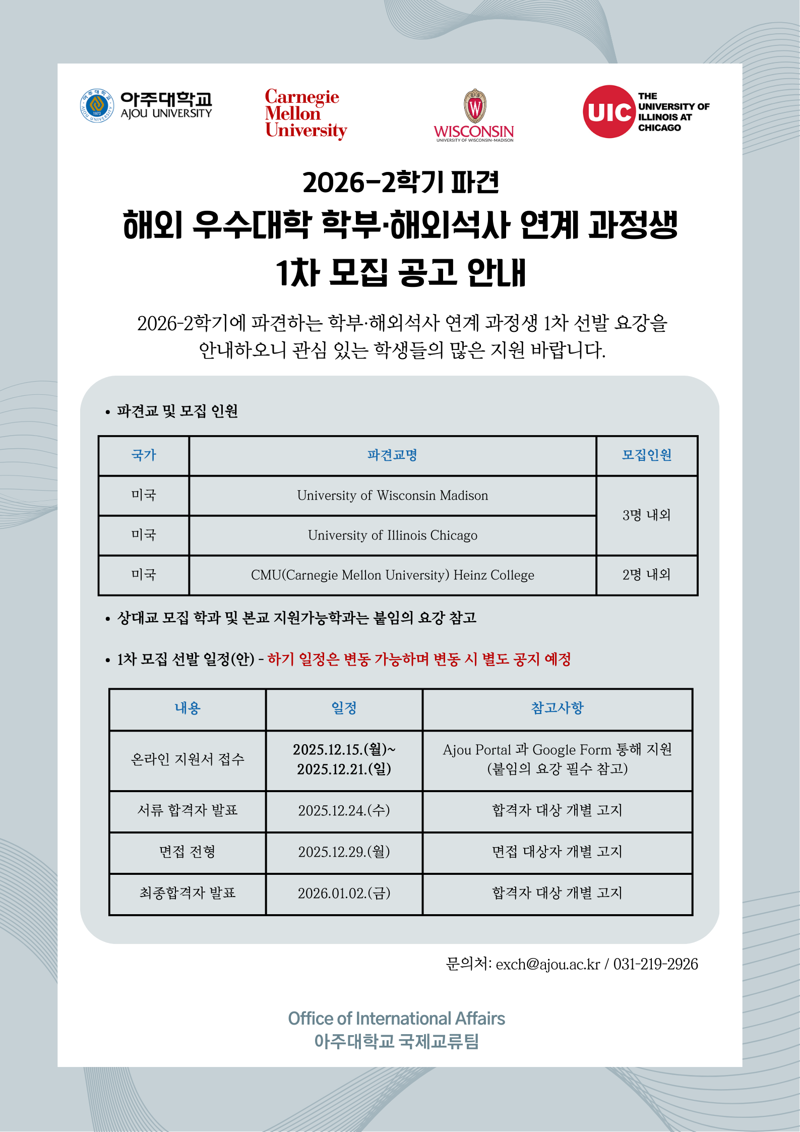 2026-2학기 파견 교환 및 복수학위 1차모집 공고